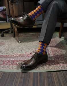 - Носите носки достаточной длины, чтобы нога не оголялась при сидении. Кстати, яркие носки, как на фото ниже, -сегодня один из мощных трендов в мужском стиле.