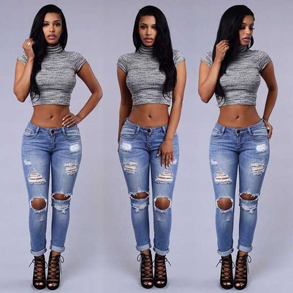 Выбирайте однотонные джинсы без потертостей. Белые пятна укорачивают ноги, делают их визуально кривыми. Порезы и дырки акцентируют внимание на полных ногах.