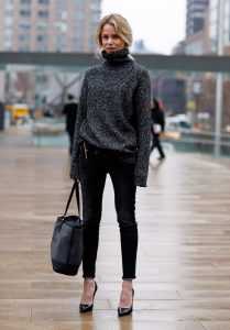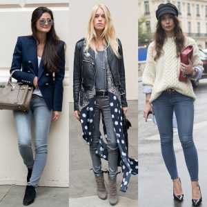 В более холодное время года с обтягивающими джинсами хорошо смотрятся массивные ботинки из кожи и ботильоны. Чтобы подчеркнуть талию, можно выбирать топы, футболки, которые легко заправлять за пояс. С небольшим выпуском такой образ будет смотреться очень женственно. То же правило относиться к кофтам и свитерам.
