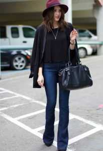 Возможно, джинсы-клёш многим покажутся не самой базовой моделью. И всё же этот вид джинсов стоит отнести к классике и той модели, которая из года в год приходит в моду как летом, весной, так и в другие сезоны. При этом джинсы-клёш также можно подразделить на несколько подвидов. Если говорить о базовом гардеробе, то более приемлемы будут джинсы полу-клёши, которые не сильно расширятся от колена. В обычной модели джинсы-клёш, начиная от колена, достигают такой же ширины, как и на бёдрах. Есть еще одна модель расклешённых джинсов под названием flared leg, клёш такой модели более экстремален и шире, чем boot cut. Именно flared leg в 60-х любили носить представители хиппи. Джинсы-клёш будут отлично сочетаться с шелковыми блузками, простыми свободными футболками, заправленными в джинсы и, конечно, с многочисленными рубашками. Кстати, в гардеробе француженки, о котором мы говорили в недавней статье, джинсы-клёш являются непременным must-have — предметом одежды на все времена и сезоны.
