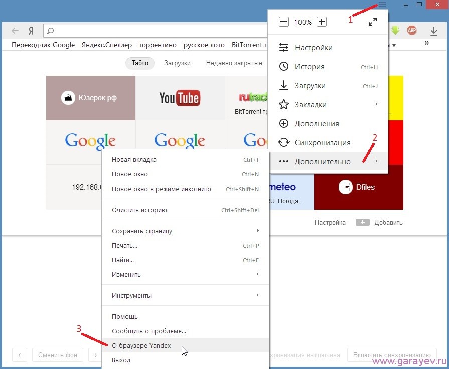 Для этого перейдите в Настройки браузера Yandex — Дополнительно — О браузере Yandex, как показано на рисунке ниже.
