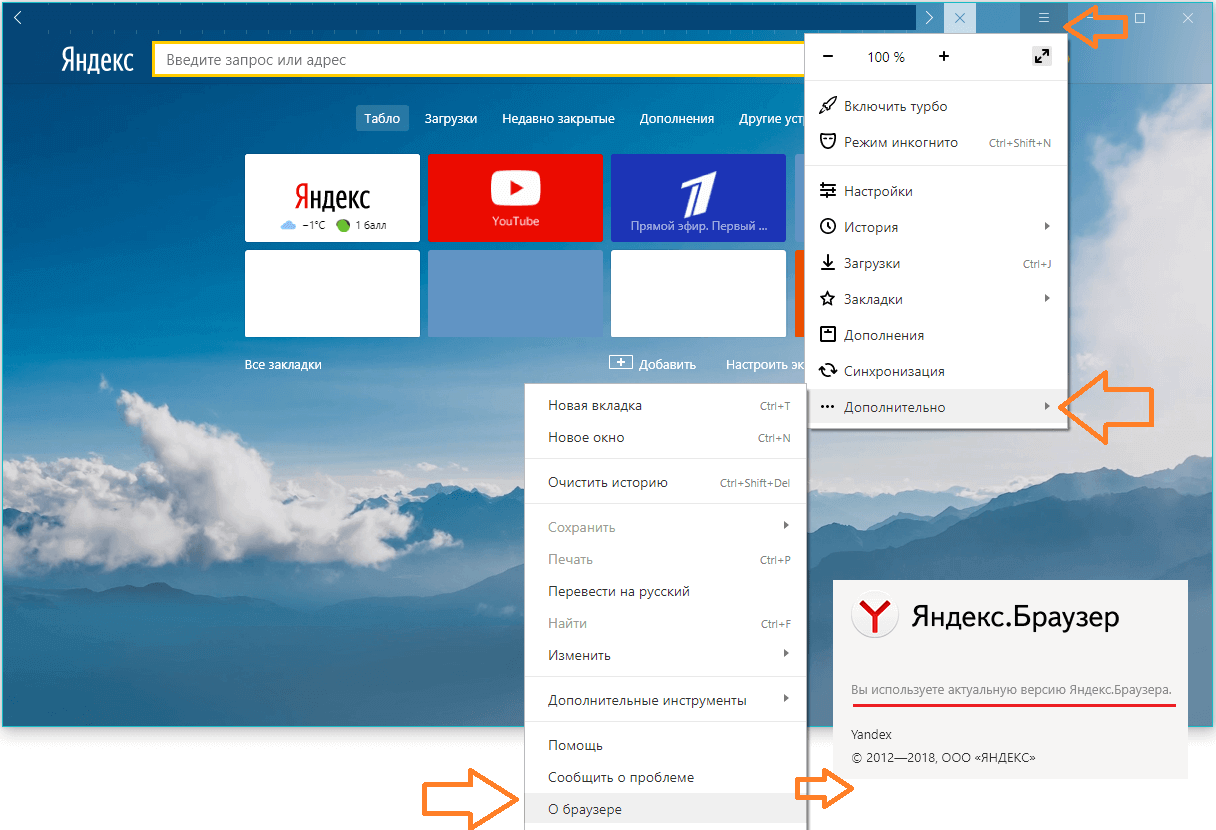 Перейти на вкладку « Дополнительно »→« О Яндекс браузере »: