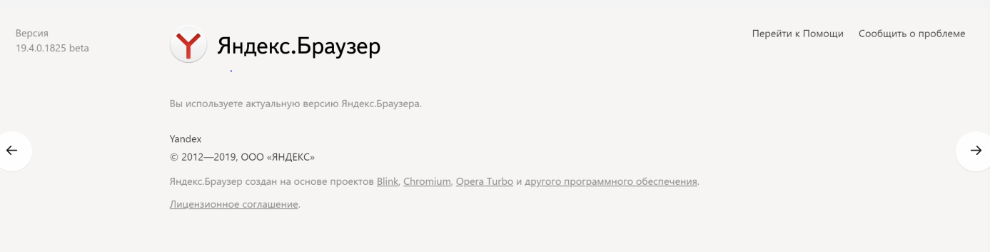 5. Снова заходим в раздел «В Яндекс.Браузере» и видим, что версия браузера поменялась на более новую, и такое же сообщение «Вы используете текущую версию Яндекс.»