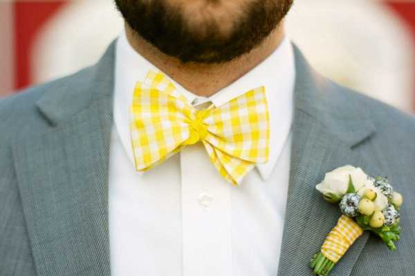 - Желтая бабочка предназначена для яркого события. Сочетаться будет с темно-синим костюмом или бежевым, а рубашку подобрать светло голубых тонов или белую.