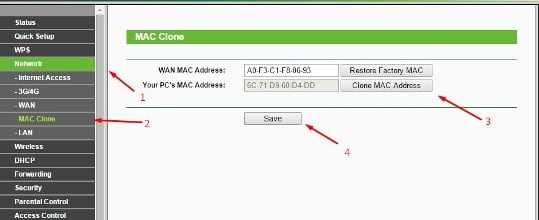 Шаг 7. В том же списке войдите в меню «MAC Clone» и укажите предпочтительный Media Access Control адрес. Опционально, можете оставить заводской, или «Клонировать» адрес Вашего персонального компьютера.