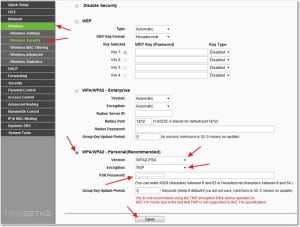Следующим шагом будет настройка безопасности маршрутизатора. Для этого в той же вкладке находится раздел «Security», здесь нужно указать тип шифрования и придумать пароль. Желательно сложный, чтобы обезопасить свой вай-фай от чужих загребущих адаптеров. Достаточно ввести все данные так, как показано на скриншоте.