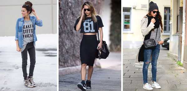 Для энергичных модниц, ведущих активный образ жизни, непременно, придутся по душе стиль кэжуал смарт и спорт кэжуал, элементы которых сродны с уличным стилем, и очень практичны в эксплуатации, ведь комбинируют комплекты со спортивной обувью и обувью на низком ходу.