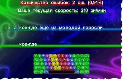 В тренажере используется свой собственный алгоритм, который постепенно и незаметно для вас увеличивает скорость, с которой вам нужно набирать символы с клавиатуры. Кстати, статистика скорости и количества ошибок доступна в верхней части окна (на скрине выше).