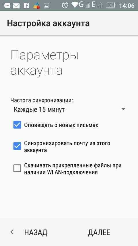 - Указать период синхронизации и получение уведомлений при поступлении новых сообщений.