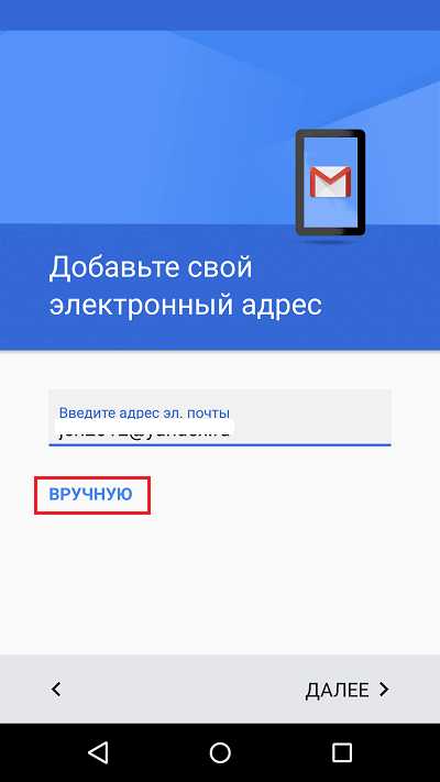 - Для начала необходимо ввести свой адрес электронной почты и нажать кнопку «Настройка вручную»