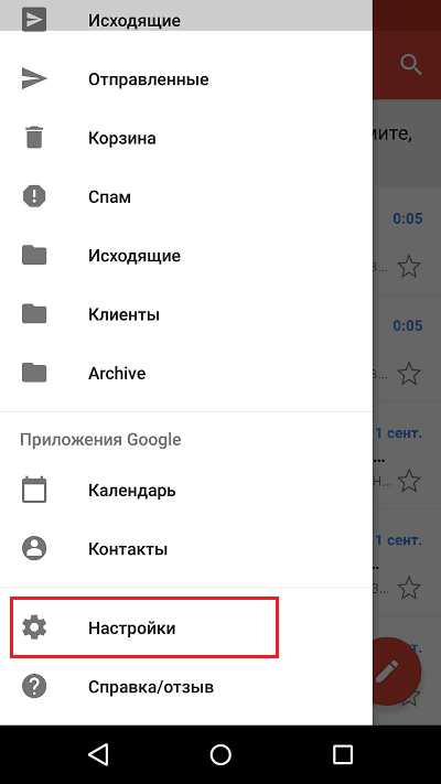 Загрузка …Чтобы выполнить настройку почтового клиента Google, необходимо нажать на три горизонтальные полоски в верхнем левом углу приложения и выбрать пункт «Настройки». Попав в раздел, можно указать следующие параметры работы программы: