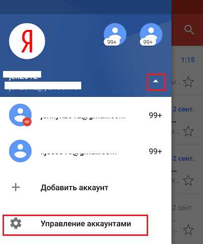 - Коснитесь кнопки «гамбургер» и откройте боковое меню. Для доступа к разделу управления аккаунтами коснитесь треугольничка, обведенного рамкой на скриншоте.