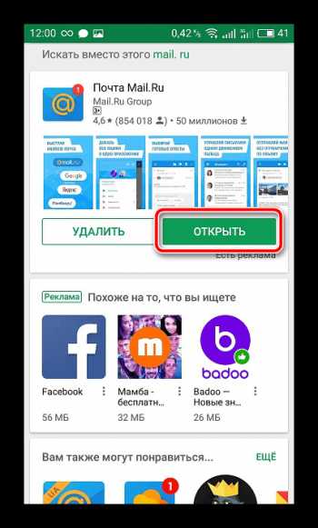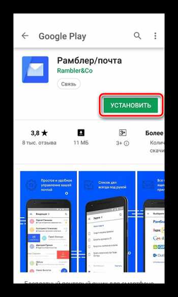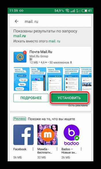 1. В поиске Play Market отыщите программу Mail.ru и нажмите на «Установить».