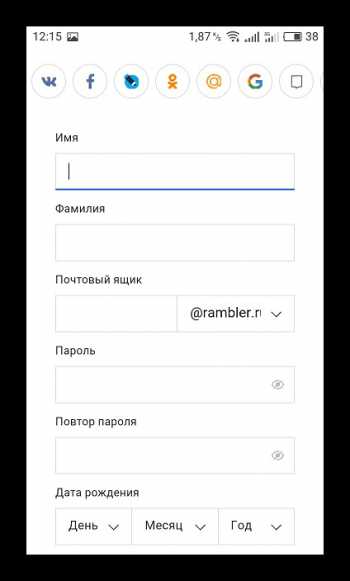3. Введите имя, фамилию, дату рождения, пароль и придумайте адрес почтового ящика. Кроме того, создание профиля может осуществляться путем подключения другой социальной сети или сервиса. Для этого тапните на необходимый значок сверху.
