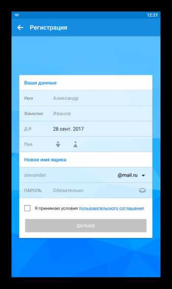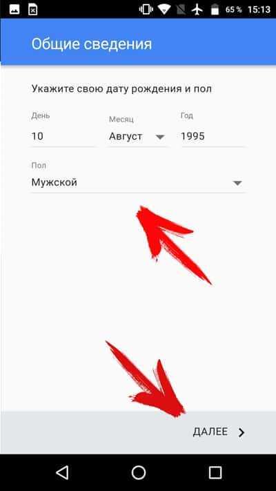 Указать пол и дату рождения. Важно! Если возраст пользователя меньше 18 лет, система может отказать в регистрации. Тогда придется создавать учетную запись при помощи ПК, а затем вносить в телефон готовый аккаунт.