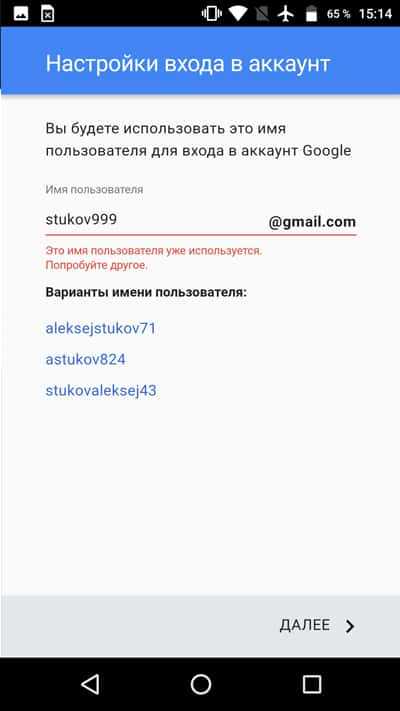 Далее требуется ввести «Имя пользователя» – название почтового ящика Gmail. Часто название может совпадать с названием других пользователей, тогда система предложит изменить название или выбрать свободное имя, сформированного на основе Имени и Фамилии.