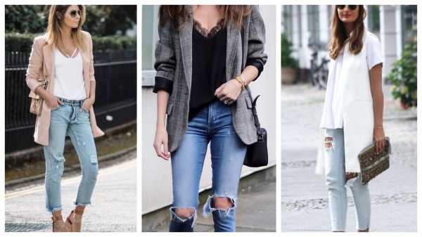 Рваные бойфренды и черный удлиненный жакет – готовый образ для вечерней прогулки, дискотеки, похода в кино или посещения офиса (если нет строгого дресс-кода). Пиджак придает взбалмошному look-у определенной строгости, приглушает его, делает серьезнее. Классно смотрятся бойфренды в тандеме с жакетом без рукавов.