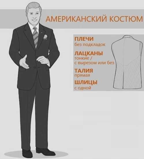 В Америке мужчины предпочитают более комфортную одежду, поэтому свободный прямой силуэт – классика американского кроя. Плечевой пояс не оформляется подплечниками, а пройма делается достаточно широкой. Пиджаки доходят до верхней части бедра, одна шлица на спинке обеспечивает удобство движений. Застёжка на 2-3 пуговицы всегда однобортная. Строгость и официальность двубортных моделей в этом стиле не приветствуется. Брюки со складками у пояса достаточно просторны.