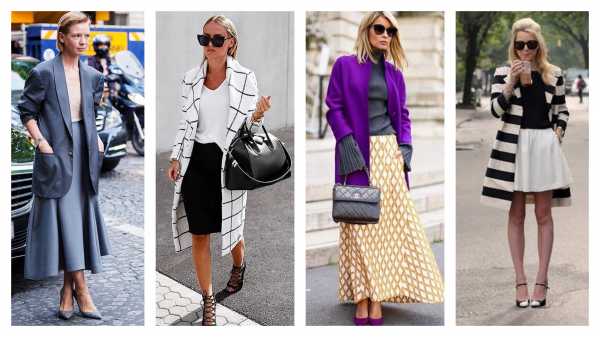 - элегантным вариантом является комбинация модного удлиненного пиджака с прямой юбкой-миди, платьем-футляр, к такому изысканному наряду подойдут туфли-лодочки на каблуке или низком ходу;