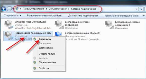 Возможно, что сетевая карта просто отключена. Давайте проверим. Зайдите в Панель управления\Сеть и Интернет\Сетевые подключения и найдите там Подключение по локальной сети. Если возле него статус Отключено, то нажмите на это соединение правой кнопкой мыши и выберите Включить.