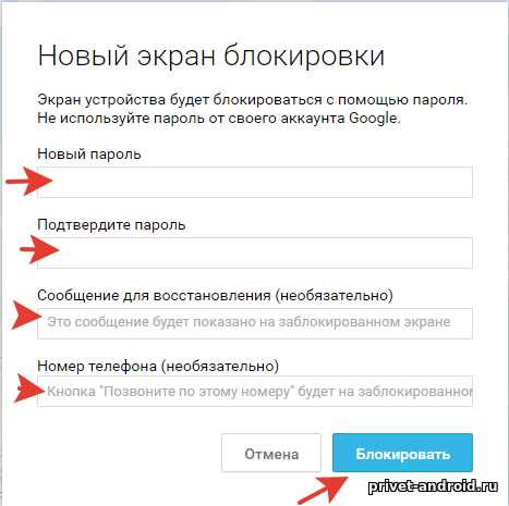По нажатию кнопки «Блокировать«перед вами должно появиться новое окно, в котором вы должны поменять пароль. Вводим свой новый пароль и в следующей строчке повторяем его. Вы так же можете написать сообщение, оно покажется на заблокированном экране, и будет вам как подсказка. Та же можно указать номер телефона, это не обязательно, но ели в друг у вас увели телефон и он заблокирован, вы для надежности меняете пароль и указываете номер, после чего на заблокированном устройстве android появится кнопка «Позвоните на этот номер», который вы указали. Когда данные изменили нажимаем на кнопку «Блокировать«