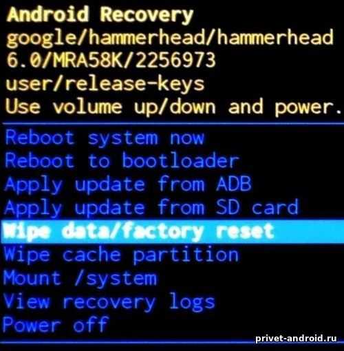 - Выполните сбрасывание смартфона wipe. Для этого необходимо выключить устройство, открыть системное меню (одновременно нажмите несколько клавиш на телефоне), отыскать строку «wipe» и выставить настройки по умолчанию.