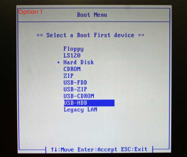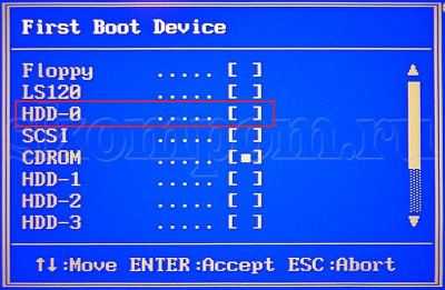 Если же здесь установлен другой параметр, стрелками выделите этот пункт меню и нажмите «Enter». В появившемся небольшом окошке выберите «Hard Disk» или «HDD-0» (в зависимости от версии BIOS) и нажмите «Enter». Маленькое окошко исчезнет.