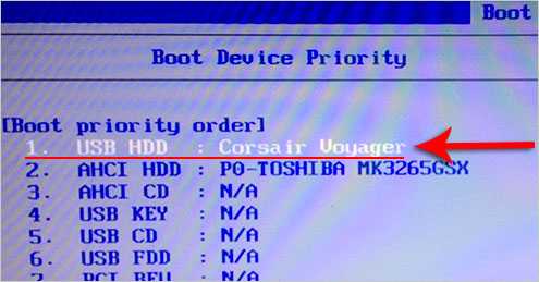 Далее нам предстоит выставить приоритет загрузки. Как видите на рисунке у нас на первом месте стоит жесткий диск HDD, а нам чтобы загрузка началась с флешки, нужно чтобы USB было на первом месте. Как это сделать?