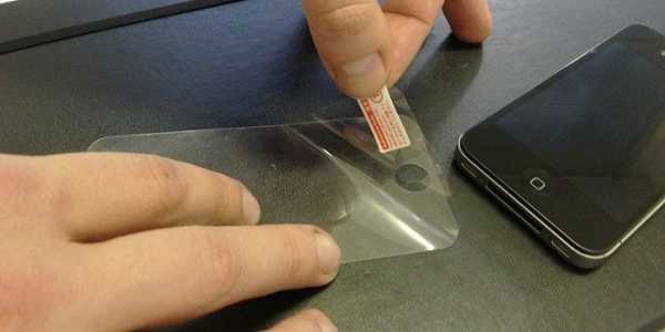 - Перед началом процедуры снимите старую пленку с девайса. Для этого немного потяните за край под углом 60 градусов.