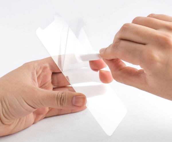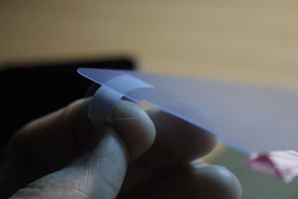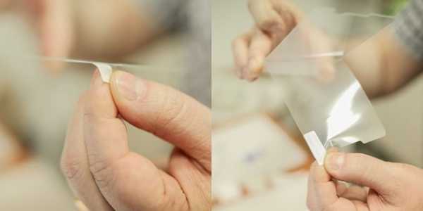 Возьмите в руки защитное стекло. С одной стороны оно покрыто плёнкой, её нужно удалить. Теперь стекло надо держать по краям, чтобы не оставить отпечатков пальцев на поверхности.