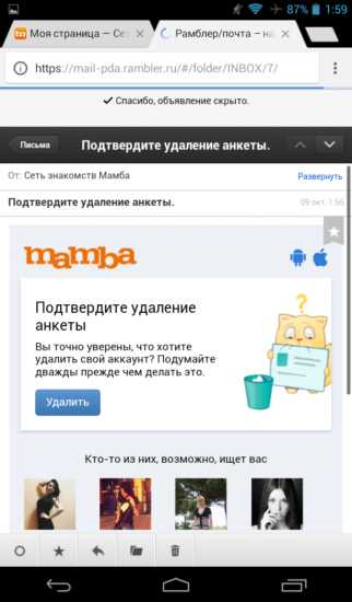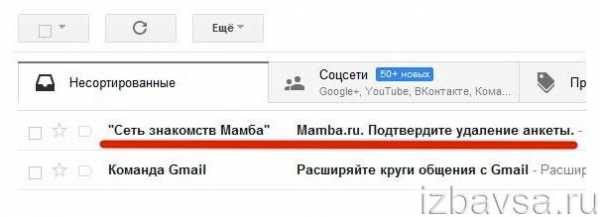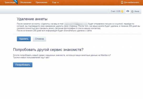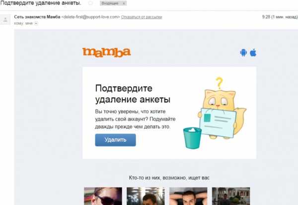 Снова нажимаем на кнопку «Удалить» и заходим на электронную почту, которая была использована при регистрации аккаунта на сайте знакомств «Мамба».