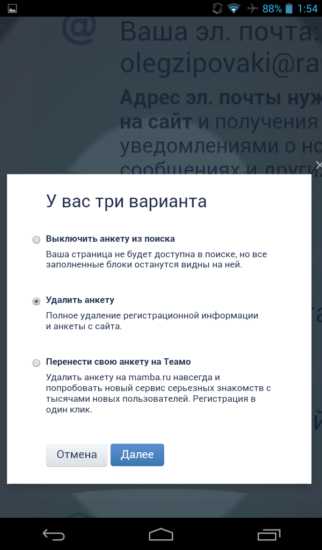 - После этого появится три предложенных варианта. Чтобы с mamba удалить профиль, необходимо будет выбрать “Удалить анкету”.