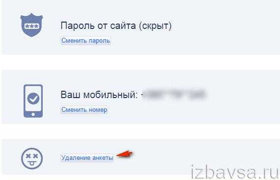 Далее просто прокручиваем страницу вниз и в перечне возможностей находим «Удаление анкеты», обозначенной характерным смайлом (см. скриншот 3).