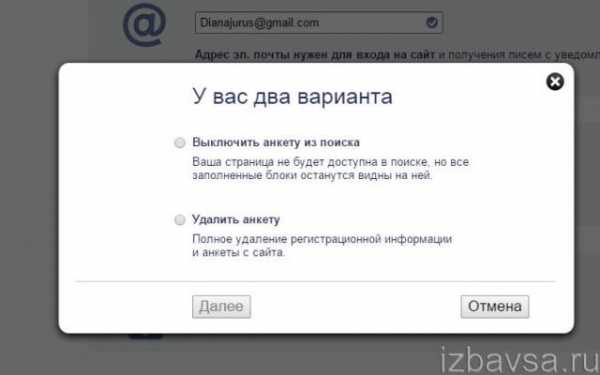 6. В дополнительном окне выберите один из двух предложенных вариантов: исключить анкету из поиска без очистки заполненных блоков или полностью удалить аккаунт. Щёлкните левой кнопкой мышки по радиокнопке возле необходимой надстройки, а затем нажмите «Далее».