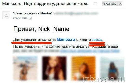 - Перед тем, как удалиться с сайта Мамба, вы получите письмо по электронной почте. В нем будет инструкция по дальнейшим действиям. Выполнив переход на личный почтовый ящик, в теме «…подтвердите удаление анкеты», откройте письмо со ссылкой.