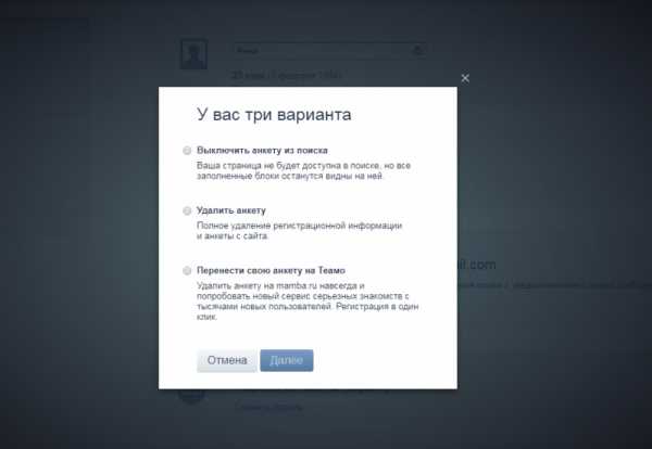 На следующем этапе потребуется выполнить простые действия, следуя подсказкам сервиса. Пользователю будет предложено три варианта ликвидации своей страницы на Mamba. Требуется выбрать удаление регистрационной информации и анкеты на портале. Затем активируется несколько раз появляющаяся кнопка «Далее».