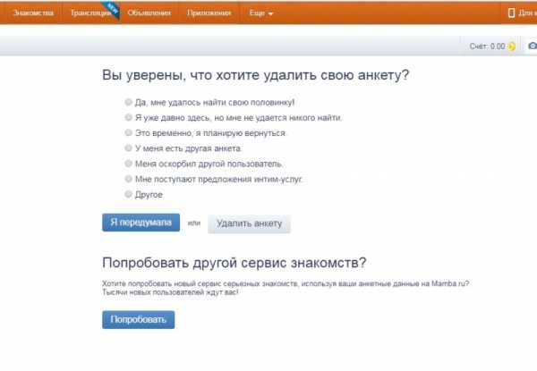 - Следующий шаг – Мамба попросит указать причину ухода. Можно выбрать любой пункт, если не хотите откровенничать с сайтом, просто нажимайте «другое».