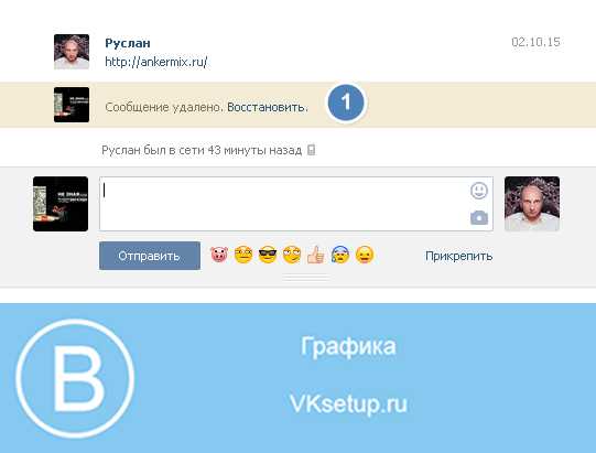 Если в процессе переписки со своим собеседником вы удалили одно или несколько сообщений, вернуть их можно очень быстро. Для этого сайт ВКонтакте предлагает следующую возможность. Нужно нажать на кнопку «Восстановление», которая находится в непосредственной близости от строки «Сообщение удалено».