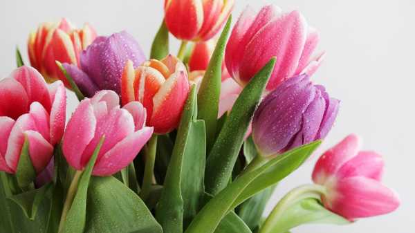Беспроигрышный вариант в конце зимы и весной. Яркие букеты в сочной зелени превосходно смотрятся и порадуют каждую девушку. Особенно красиво смотрятся букеты из тюльпанов разных расцветок – белых, желтых, красных, розовых.