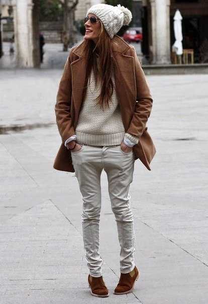 Лучше всего с пальто смотрятся шапки не мелкой вязки. Бубоны — очень хорошее дополнение к шапке, но можно подобрать шапку и без них. Но стилисты категорично против того, чтоб женщина надевала такую шапку с объемистым пальто. А пальто спортивного покроя или классического, а также приталенное — отлично можно сочетать с такими головными уборами.