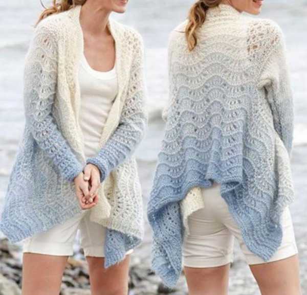 Также большой популярностью сегодня пользуется асимметричная кофта. Сзади она длинная, а спереди немного короче. Иногда такая вещь может иметь удлиненные бока, но передняя часть редко достигает даже линии бедер.