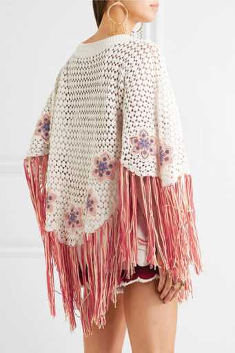 - Изделия до колена придают образу легкости и грации. Они изготавливаются как из тонкой, струящейся, так и из толстой пряжи. В такой длинной накидке вы точно не замерзнете. А сочетать их можно с любой одеждой от элегантного платья, до рваных джинсов.