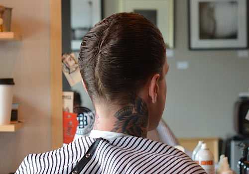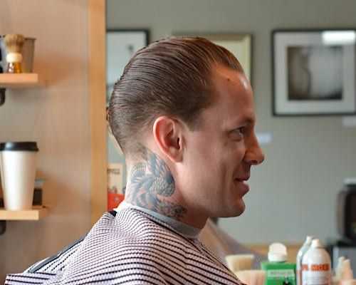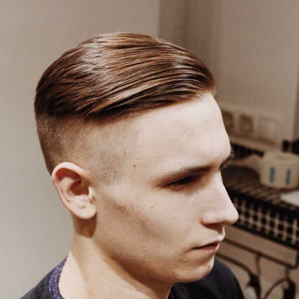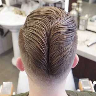 При выполнении этой стрижки мастер выстригает или выбривает виски, челка при этом удлиненная и уложена назад к затылку.