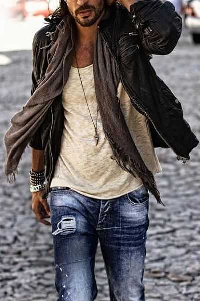 Идеальные джинсы для неформальных мероприятий весной и летом. Можно купить брюки из джинсовой ткани с потертостям или добиться подобного эффекта самому. Они должны сидеть по фигуре, но не слишком обтягивать.