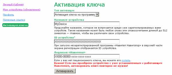 Анкета для активации ключаВажно! Код активации можно найти, если после подключения навигатора к компьютеру зайти в корневой каталог встроенного диска (памяти), а не съемного. После открытия файла лицензионый ключ будет виден на второй строчке – Navitel license key.