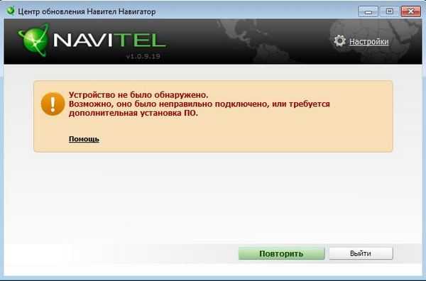Попробуете заново подключить устройство и нажмите кнопку «Повторить». Если это не помогает, то подключите навигатор с обратной стороны компьютера или возьмите более короткий USB-кабель.