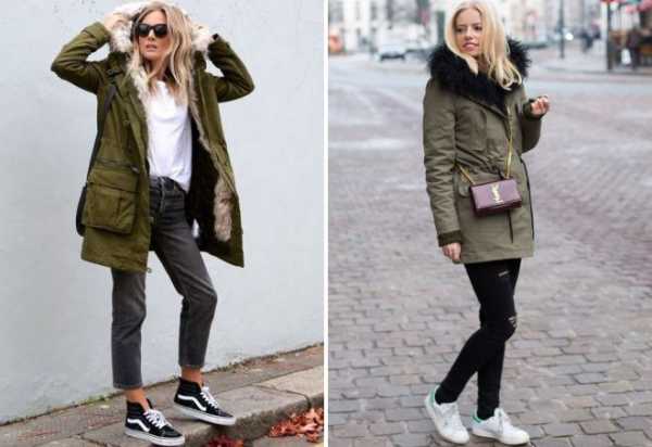 - Парка. В холодный период удачным решением станет функциональная парка. Учитывая, что крой таких курток, как правило, удлиненный, брюки стоит подбирать контрастного оттенка, лучше светлого. А вот обувь может быть одной расцветки с верхом или в ярком, принтованном или контрастном дизайне.