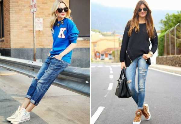 - Джинсы с высокими кроссовками. Модным трендом последних сезонов стала обувь завышенной формы, закрывающей щиколотку. Такой вариант стоит сочетать с джинсовыми брюками узкого силуэта или с подворотами штанин.