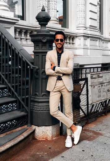 Плохо смотрятся черные кроссовки с костюмом (пример ниже). Несмотря на то, что они простые, низкие, а костюм — кэжуал, вид получается, как будто вы решили подобрать спортивную обувь, максимально приближенную к формальной, однако ничего хорошего из этого не вышло — быстрый взгляд легко распознает фальшивку.