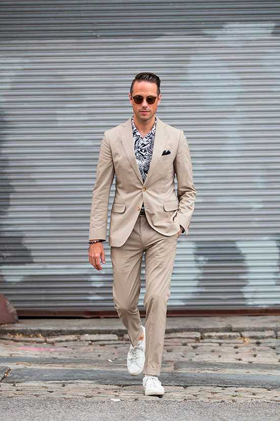 - Отлично подходят для сочетания со спортивной обувью нестрогие костюмы: из хлопка, льна, шерстяной фактурной ткани.